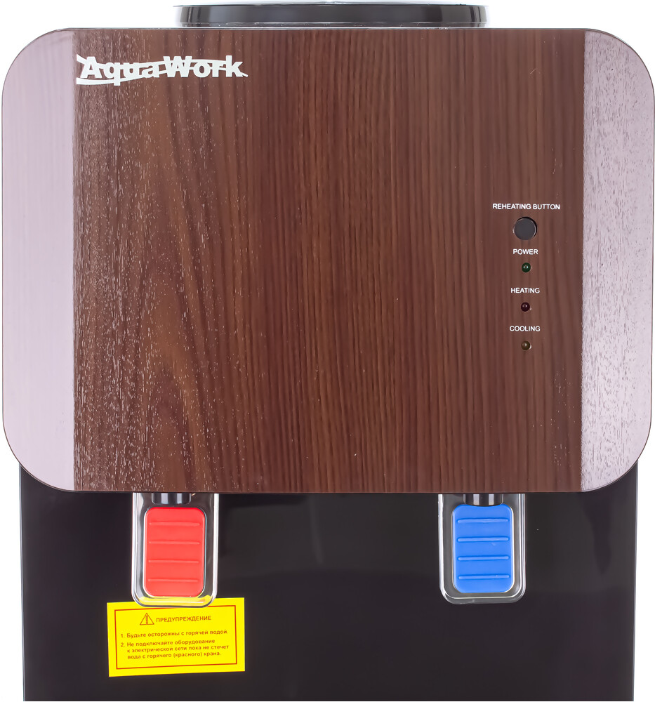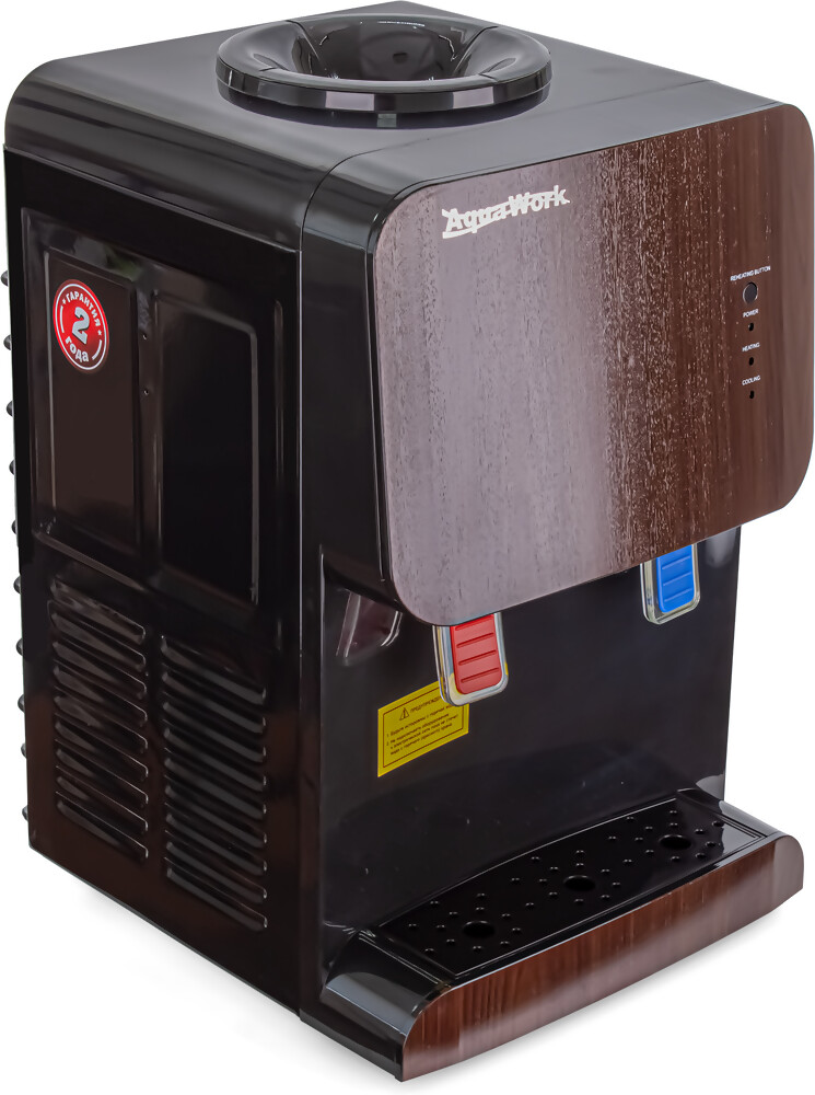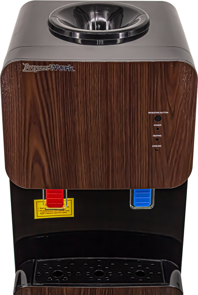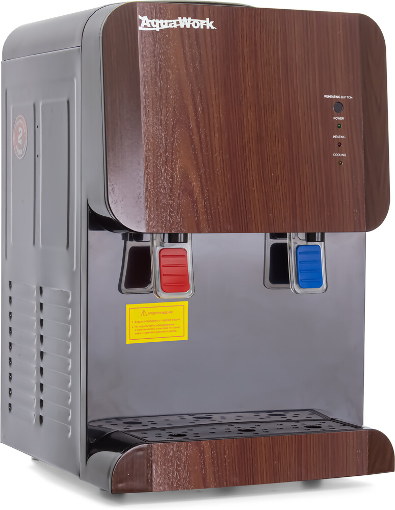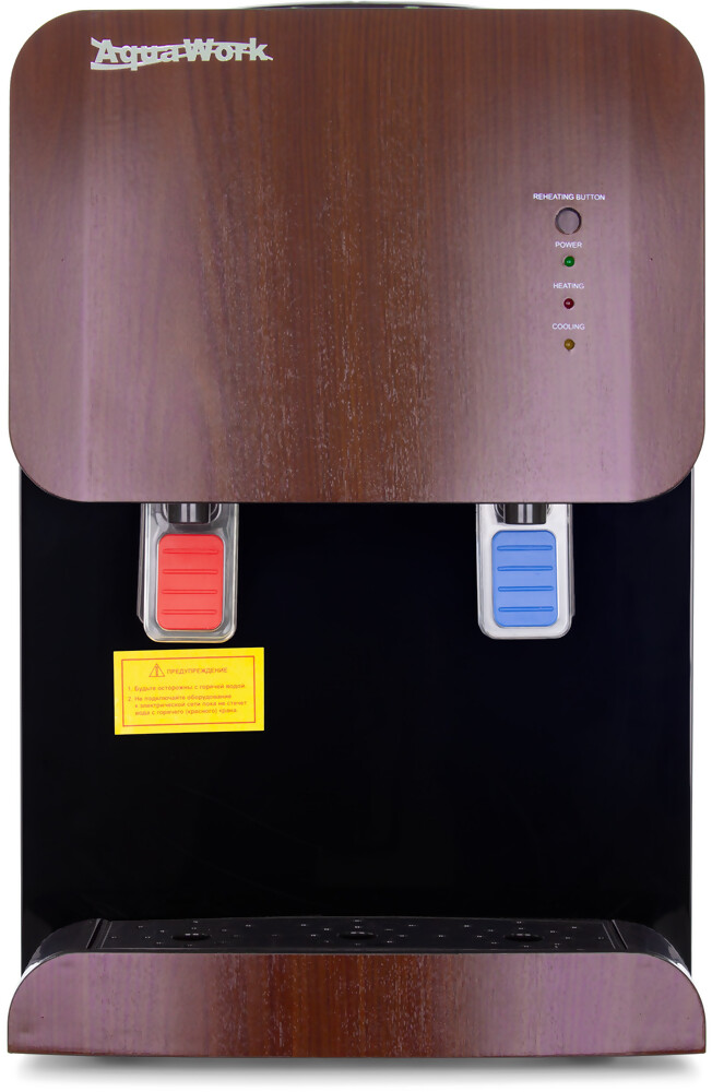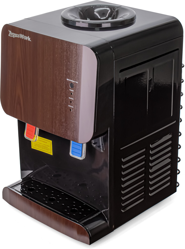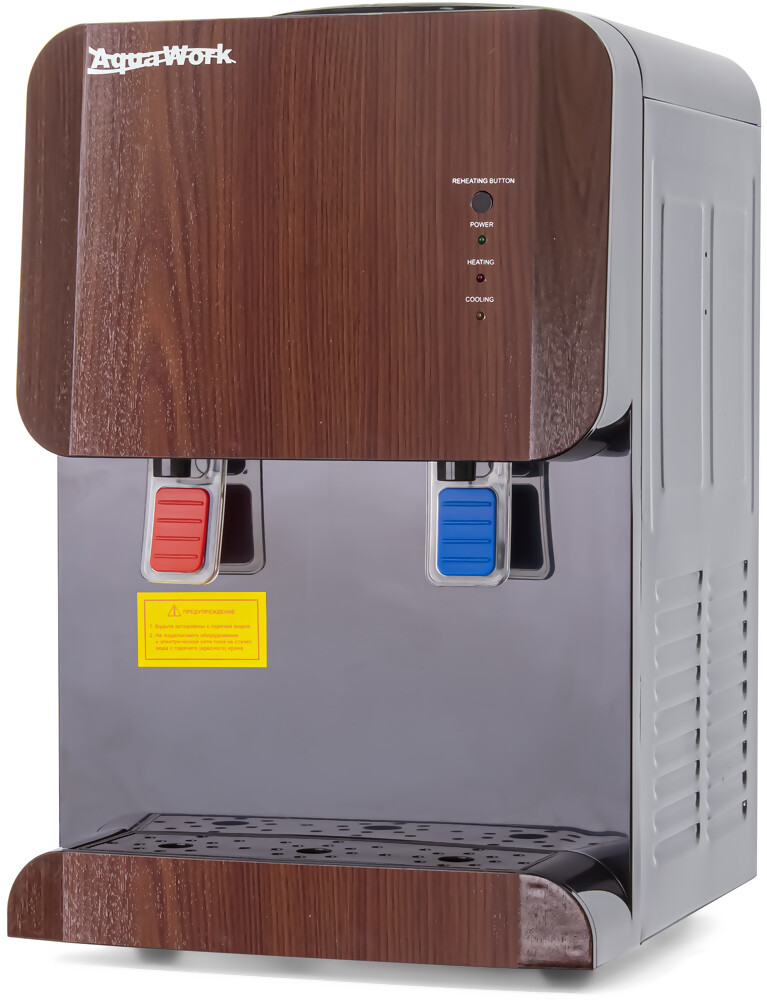 Настольный кулер для воды Aqua Work 105-TR с нагревом, компрессорной системой охлаждения, стальным корпусом и кнопкой принудительного подогрева.