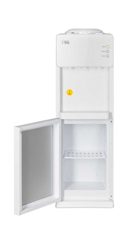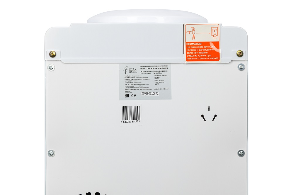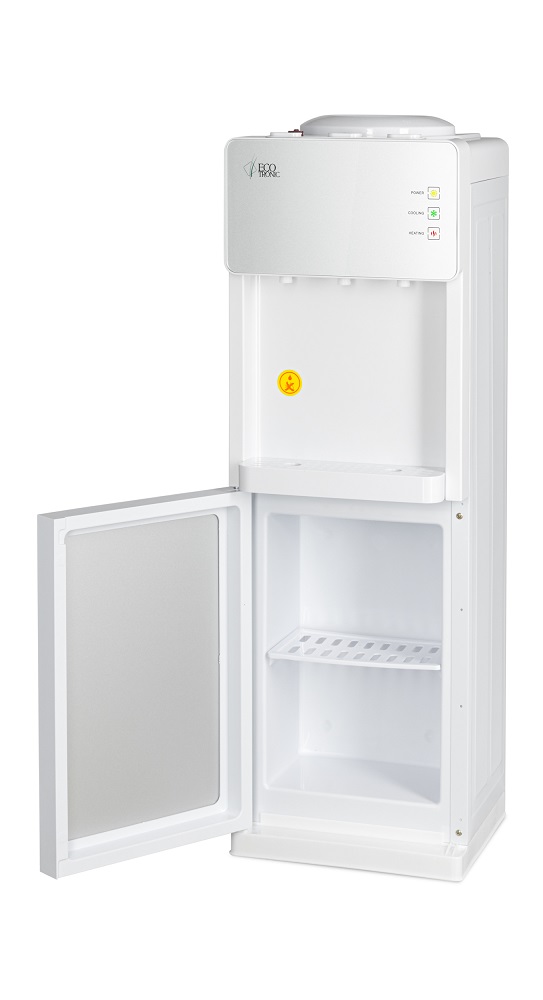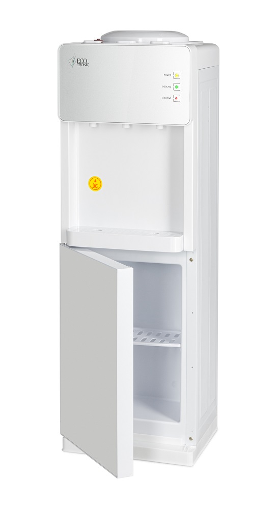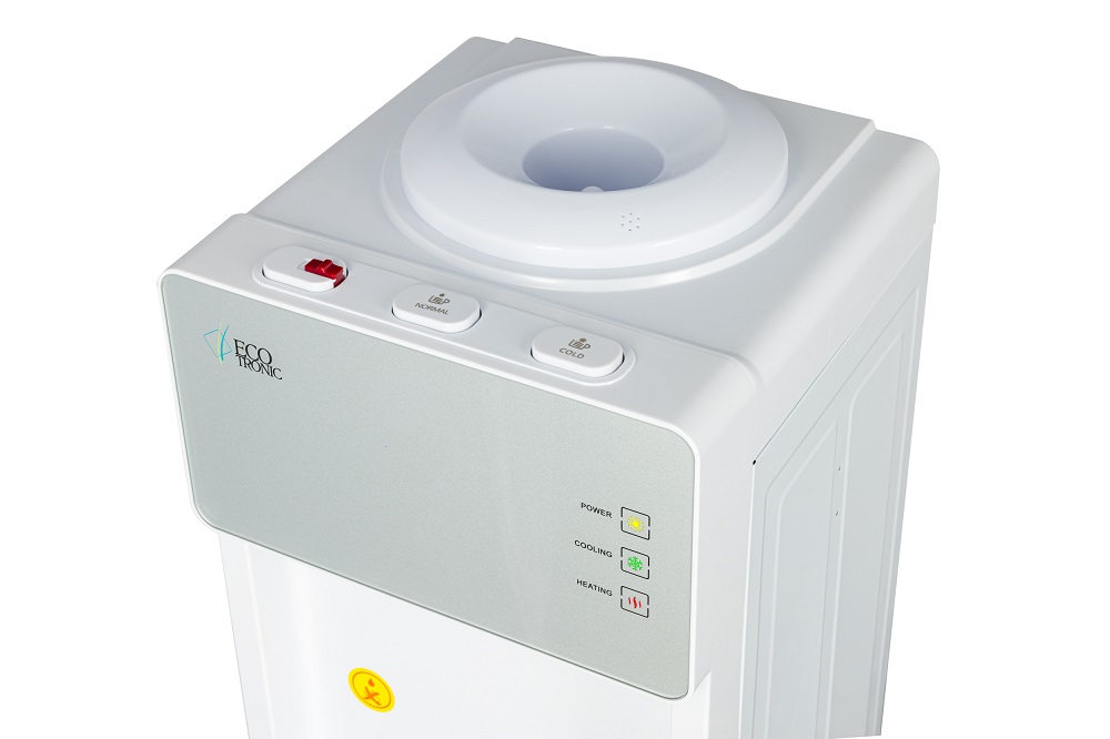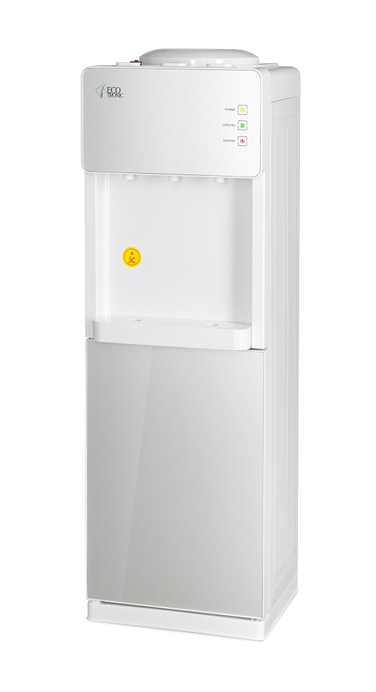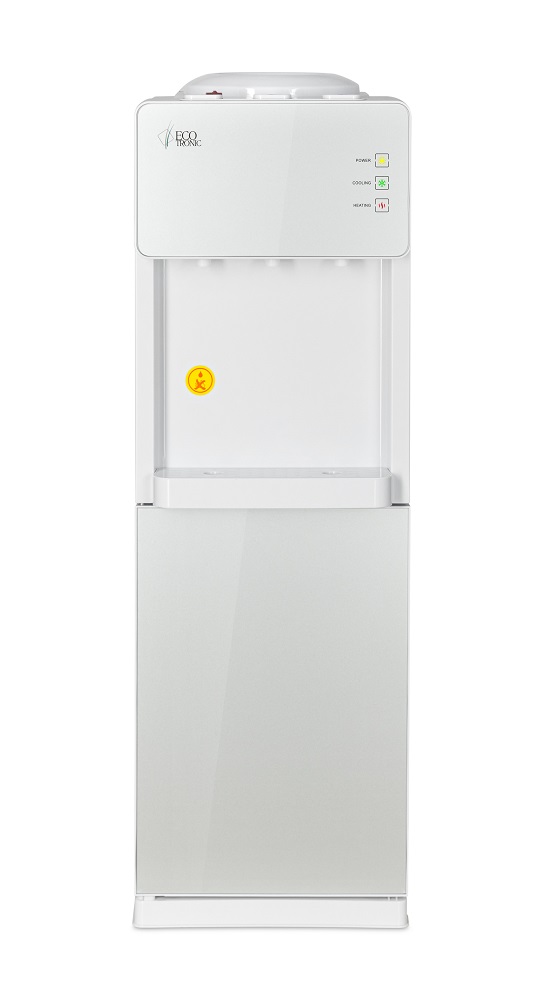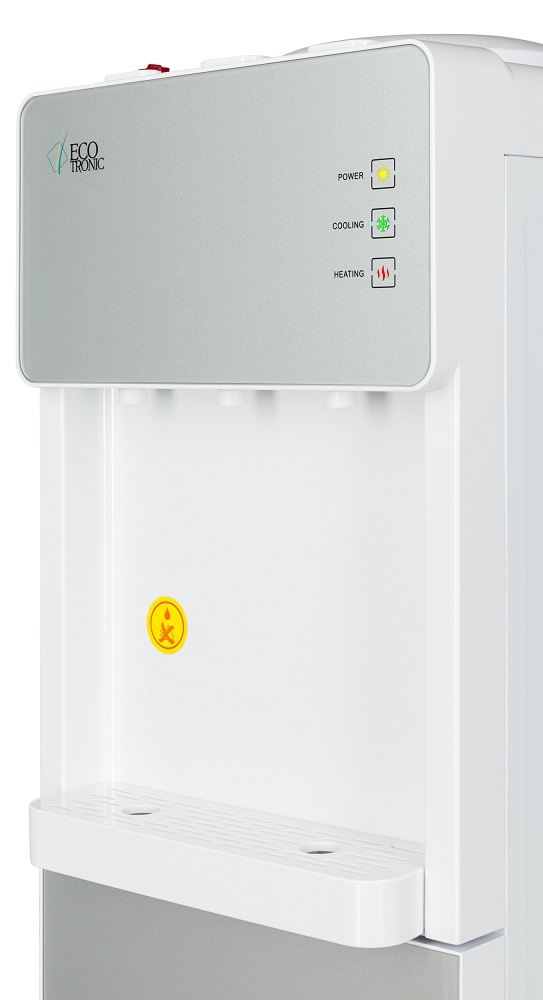 Кулер для воды Ecotronic K23-LCE XS white-silver — напольный аппарат с нагревом, электронным охлаждением и шкафчиком в нижней части. Три крана подачи воды (клавиши): для подачи горячей воды, холодной и комнатной температуры (из бутыли). Защита на кране горячей воды. Корпус белого цвета с серебристой вставкой на эффектной стеклянной передней панели. В верхней части расположены светодиодные индикаторы работы, нагрева и охлаждения.