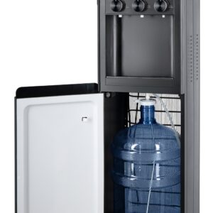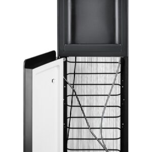 Необычный внешний вид кранов, стильный корпус полностью черного цвета и нижний отсек, в котором полностью скрывается бутыль, позволяют эффектно вписать этот кулер в современный интерьер с продуманным дизайном.