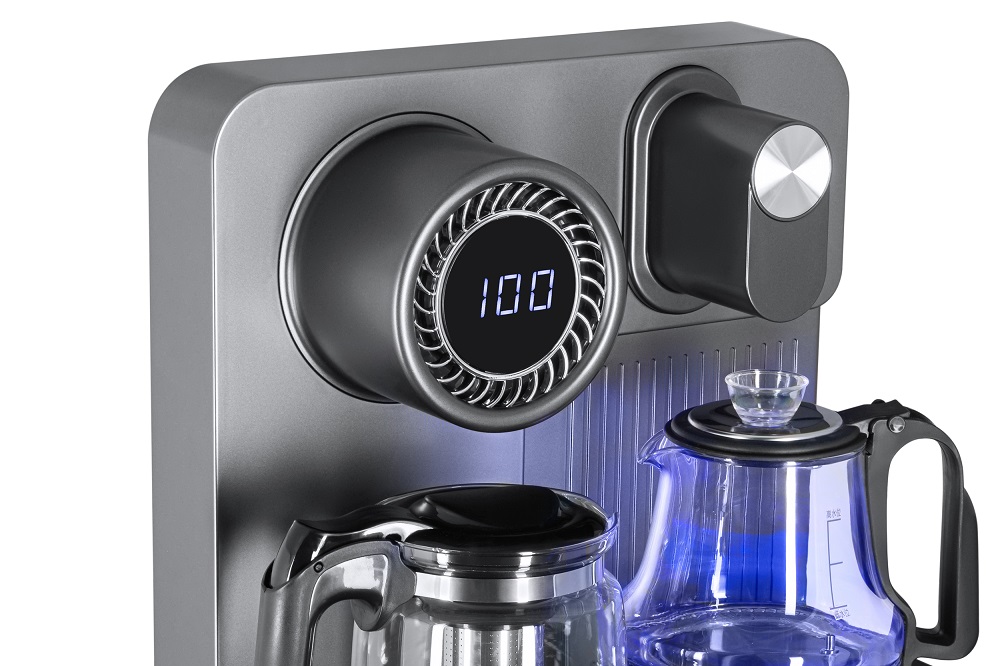 Подача воды без открытия крышки. Правый кран подает воду непосредственно в чайник, левый кран — для подачи воды комнатной температуры из бутыли.