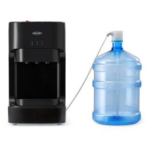 Бутыль с водой подключается к кулеру через гибкую трубку и может быть установлена в удобном месте, на расстоянии до 3 метров от кулера. Подача воды из бутыли осуществляется при помощи встроенного в кулер насоса (как у напольного кулера с нижней загрузкой бутыли) и её не нужно поднимать на кулер. При этом, бутыль может быть спрятана в шкафу, в кухонном столе, или под столом и не находиться на виду, внося диссонанс в интерьер.